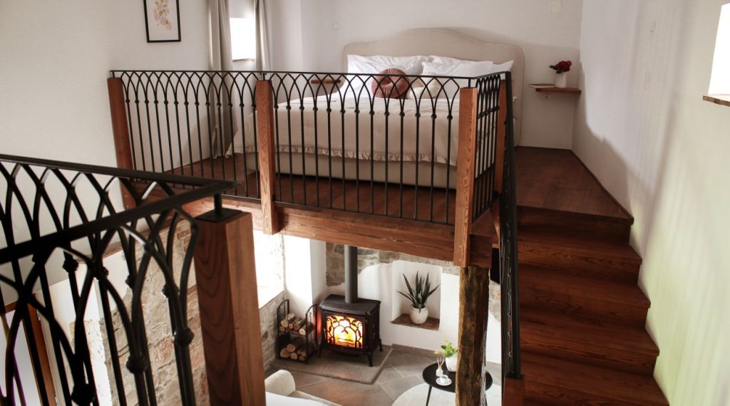 Apartma v prvem nadstropju se razprostira v dveh etažah, povezanih z lesenimi stopnicami, ki prostoru dodajajo toplino in značaj. V spodnjem delu so prostorna kuhinja, jedilnica s pečjo na drva ter kopalnica opremljena z izbrano butično kozmetiko. Zgornji prostor je svetel, zračen in odprt, z vidnim stropom, ki ustvarja občutek prostornosti. V njem stoji velika