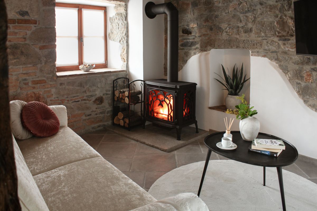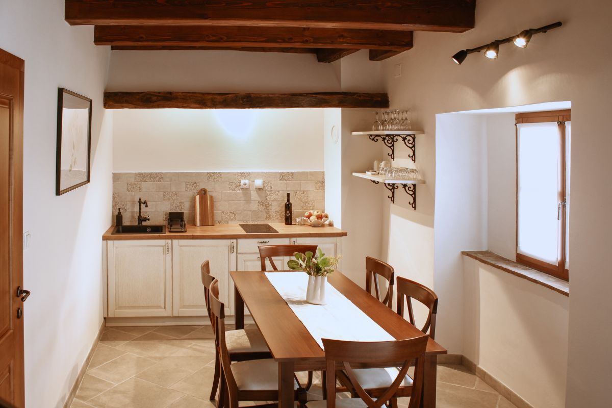 Apartma v prvem nadstropju se razprostira v dveh etažah, kjer se tradicija naravno prepleta z udobjem sodobnega bivanja.