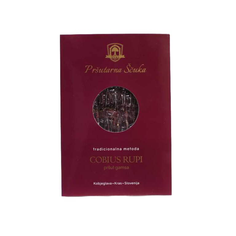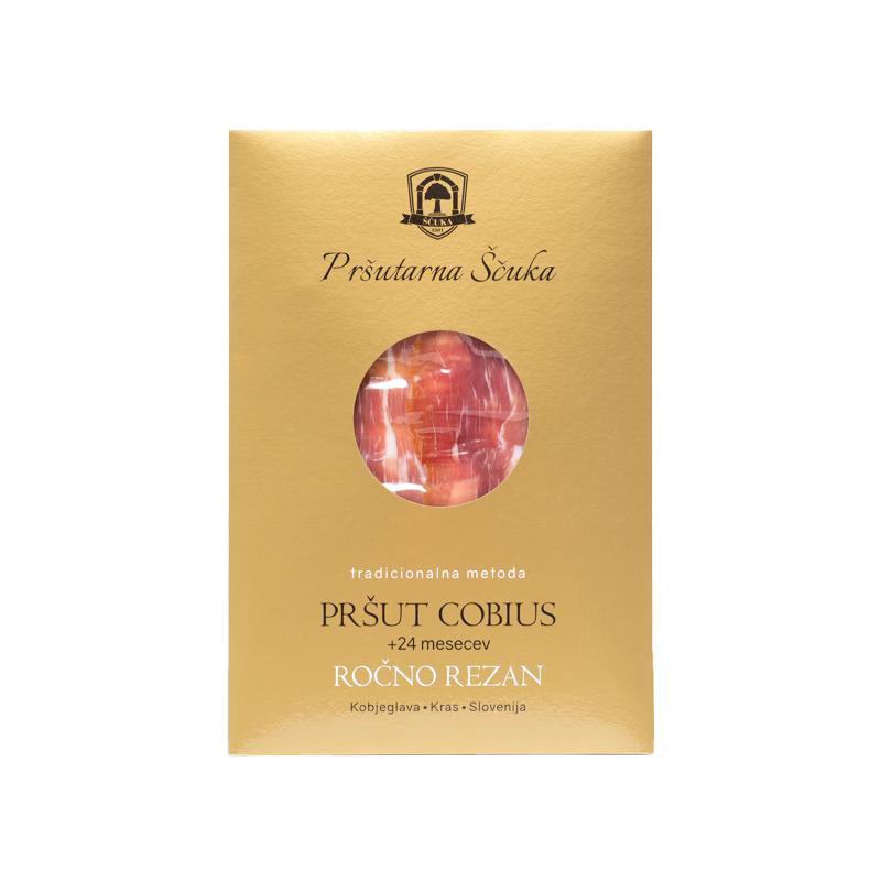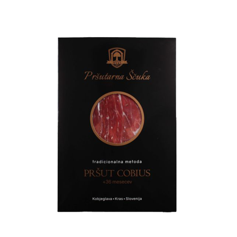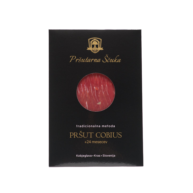 Gift box contains: – prosciutto Cobius aged for 24+ months, sliced, 100 g – prosciutto Cobius aged for 24+ months, hand-sliced, 100 g – pancetta Morus, sliced, 100 g – teran sparkling wine Chateau Intanto, Jazbec