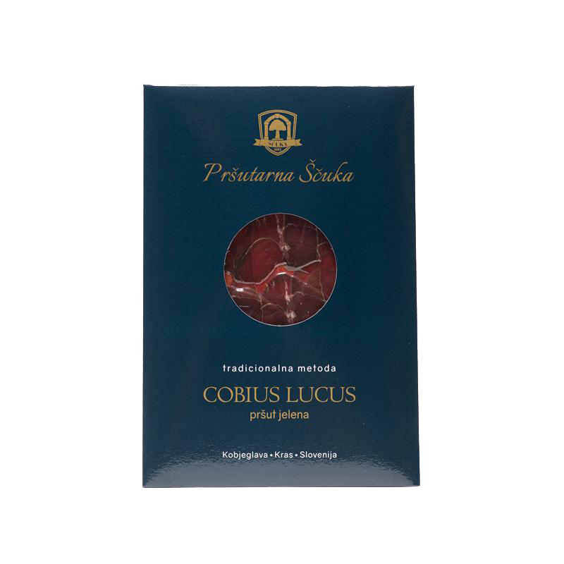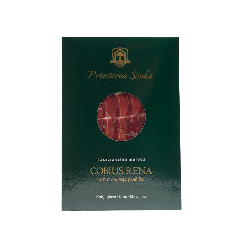 Gift box contains: – prosciutto Cobius aged for 24+ months, sliced, 100 g – prosciutto Cobius aged for 24+ months, hand-sliced, 100 g – pancetta Morus, sliced, 100 g – deer prosciutto, sliced, 50 g – wild boar prosciutto, sliced, 50 g