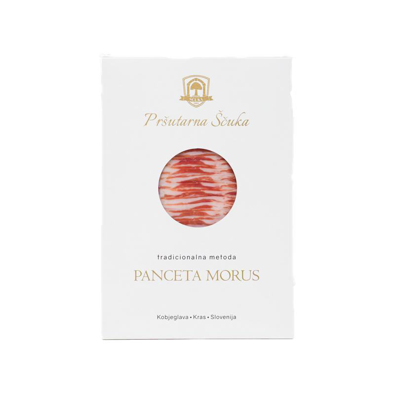 Pancetta Morus is cured on wooden racks, with manual regulation of passage of Karst air into the prosciutteria. The exchange of layers of meat and fat with a hint of pepper gives pancetta Morus a uniquely delicious taste.